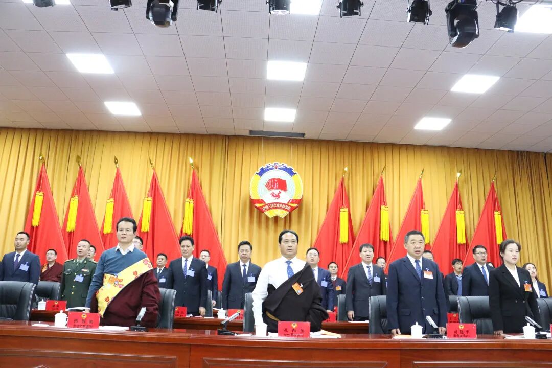 开幕大会执行主席扎西加、司建平、格智加、潮加、刘莹、都娟成、土旦沃赛塔义在主席台前排就座,扎西加主持大会。